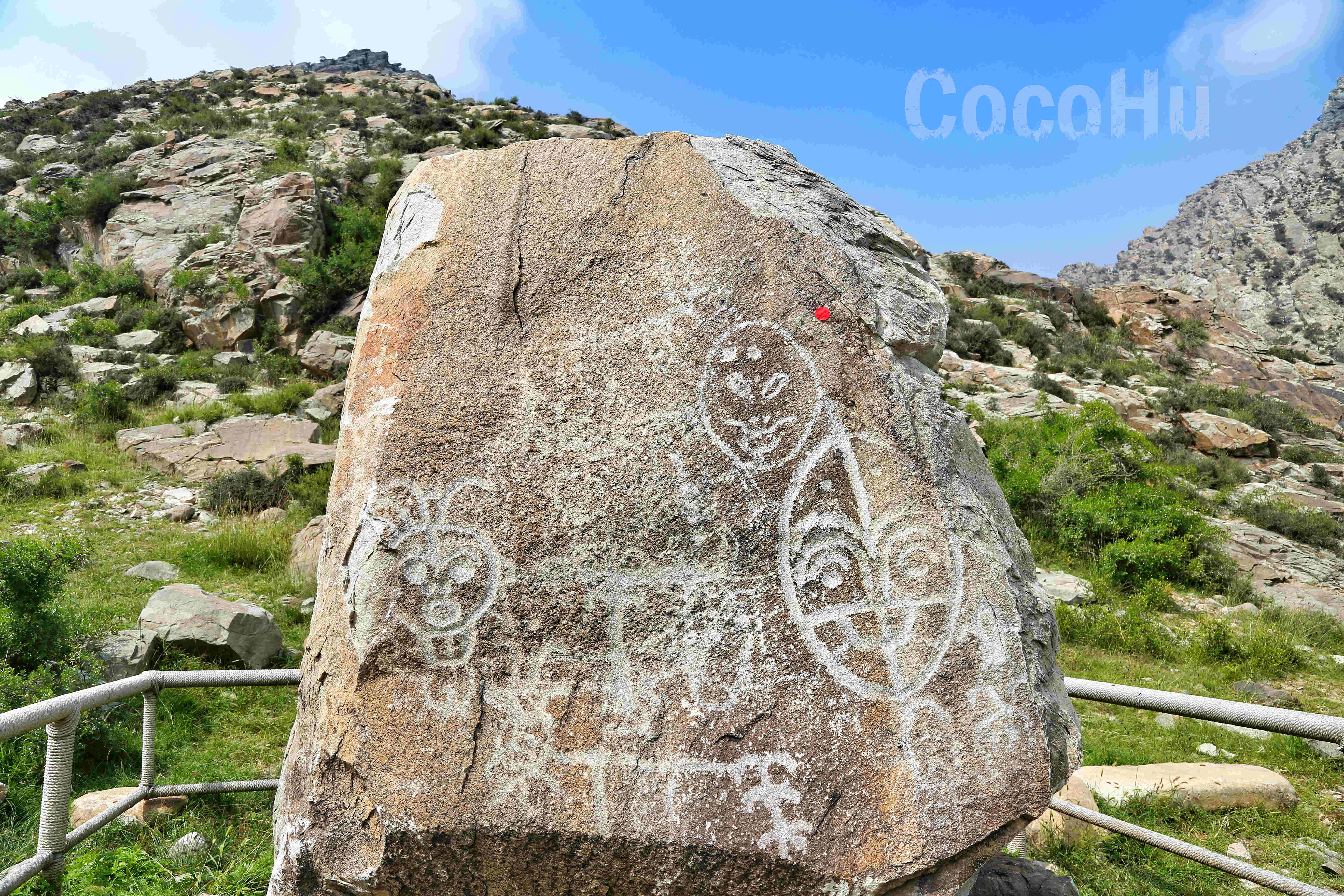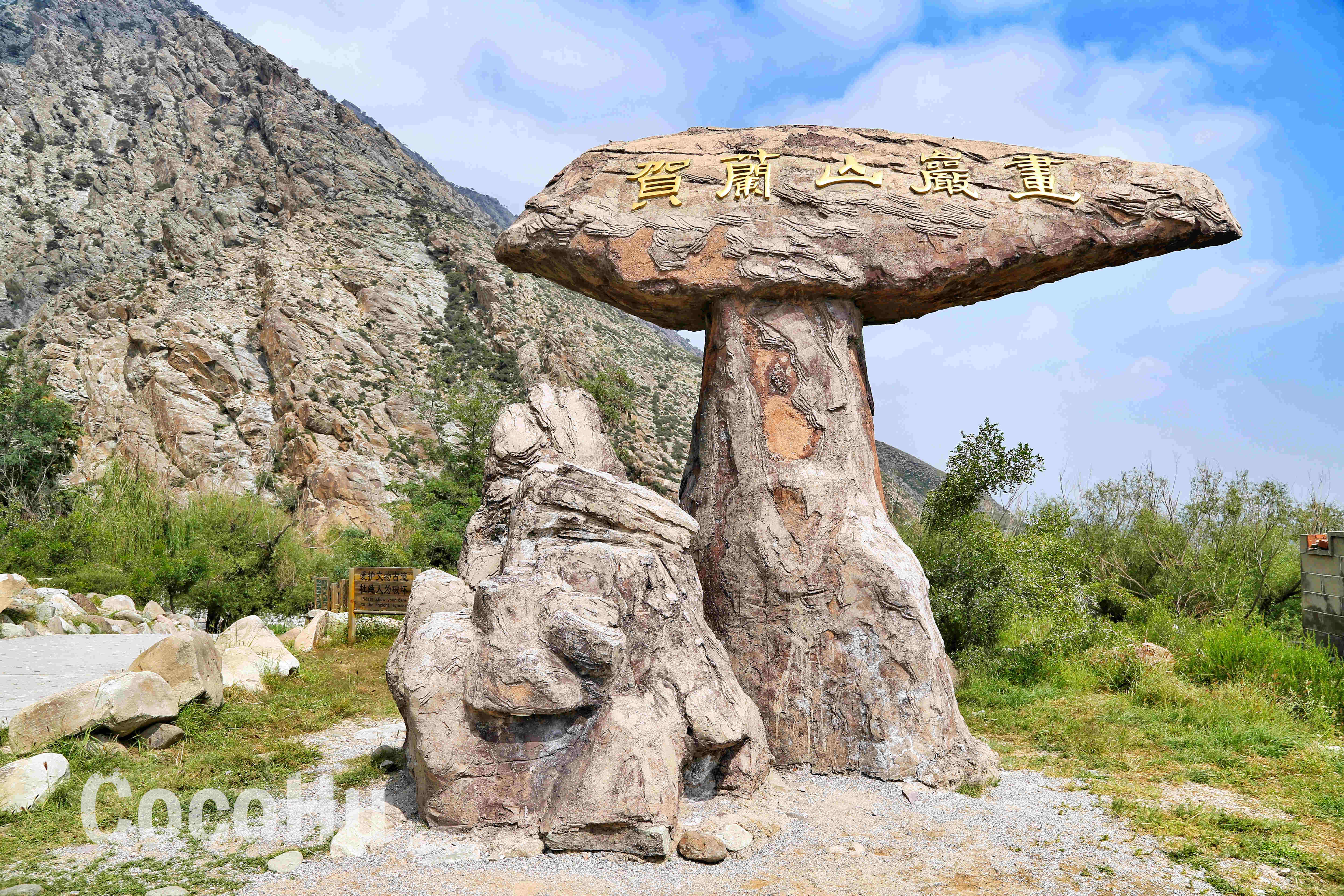 贺兰山口景色幽雅,奇峰叠障,潺潺泉水从沟内流出,约有千余幅个体图形的岩画分布在沟谷两侧绵延600多米的山岩石壁上。以人首像为主的占总数的一半以上,其次为牛、马、驴、鹿、鸟、狼等动物图形。