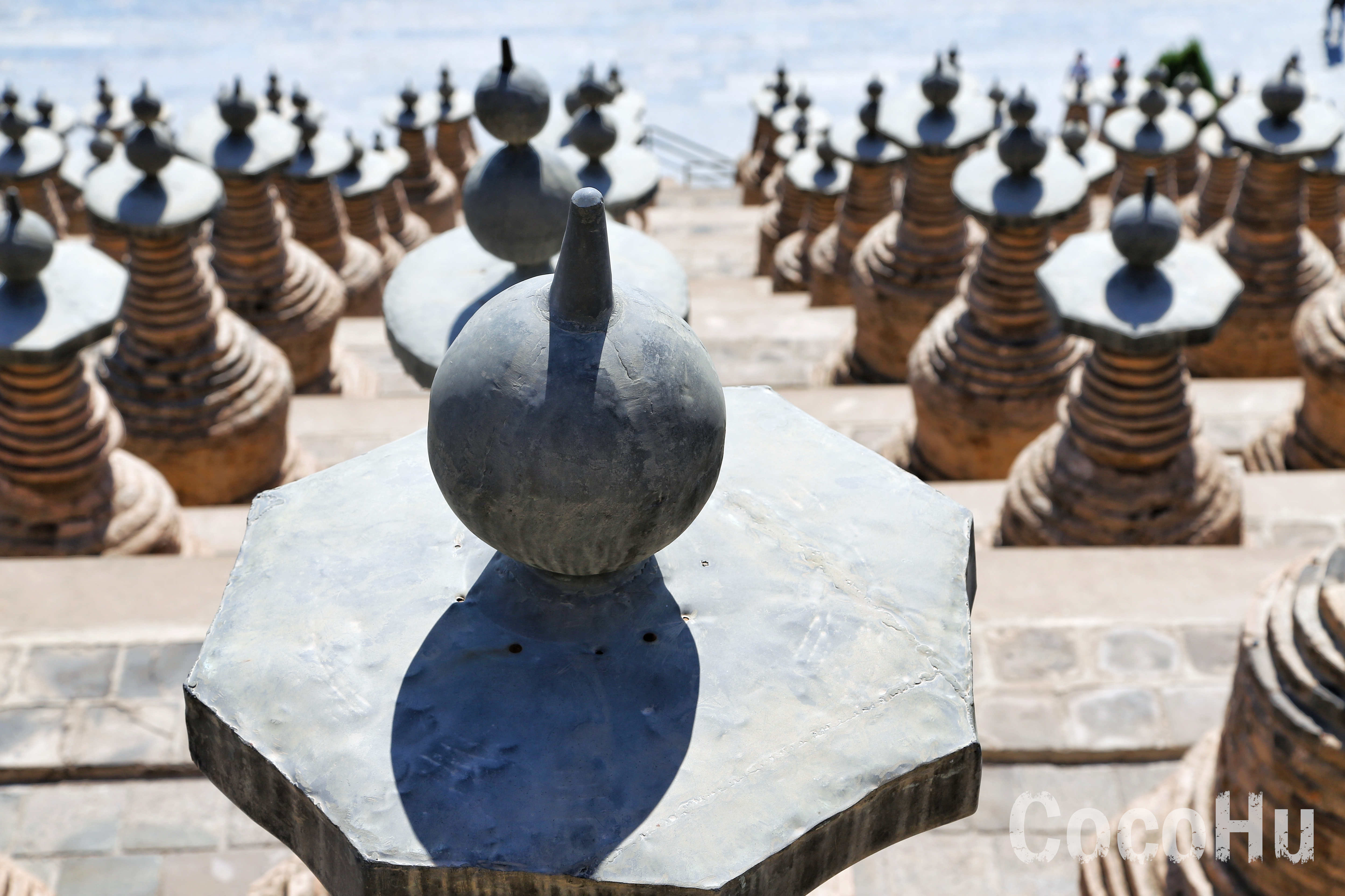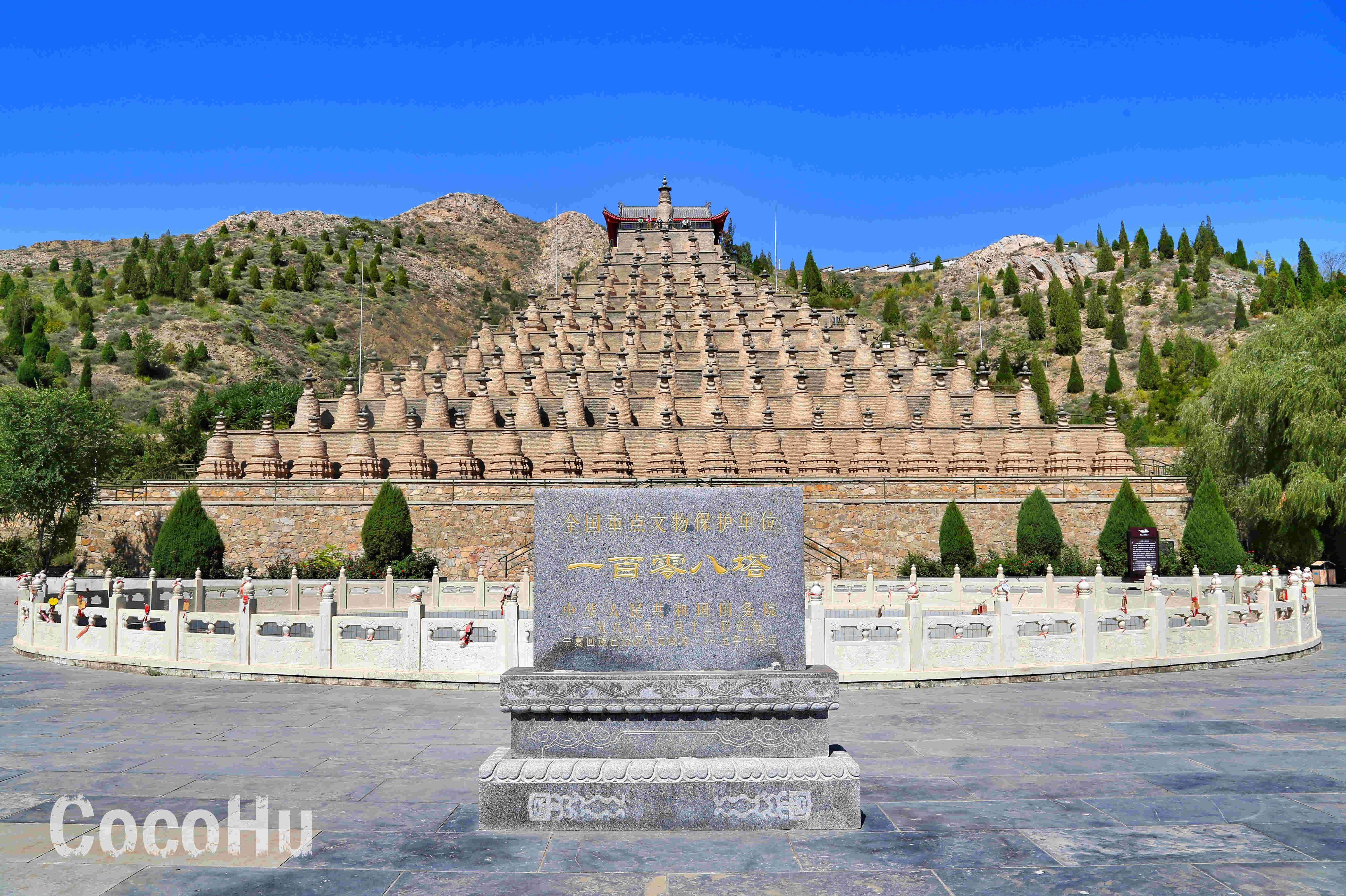 一百零八塔是中国现存的大型古塔群之一,佛塔依山势自上而下,按1、3、3、5、5、7、9、11、13、15、17、19的奇数排列成十二行,总计一百零八座,形成总体平面呈三角形的巨大塔群,因塔数而得名。
