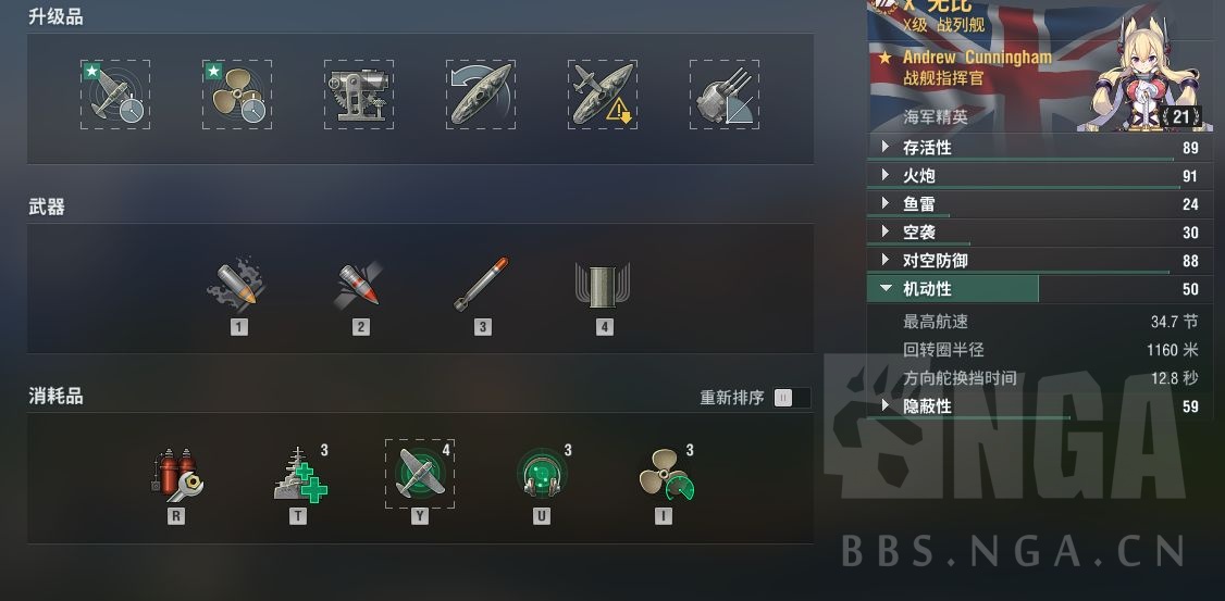 无比拥有侦察机,英驱水听,大保健(数量2个,半伤50%回复率核心区10%,总回复最大血量的40%),引擎增压(8%航速)。