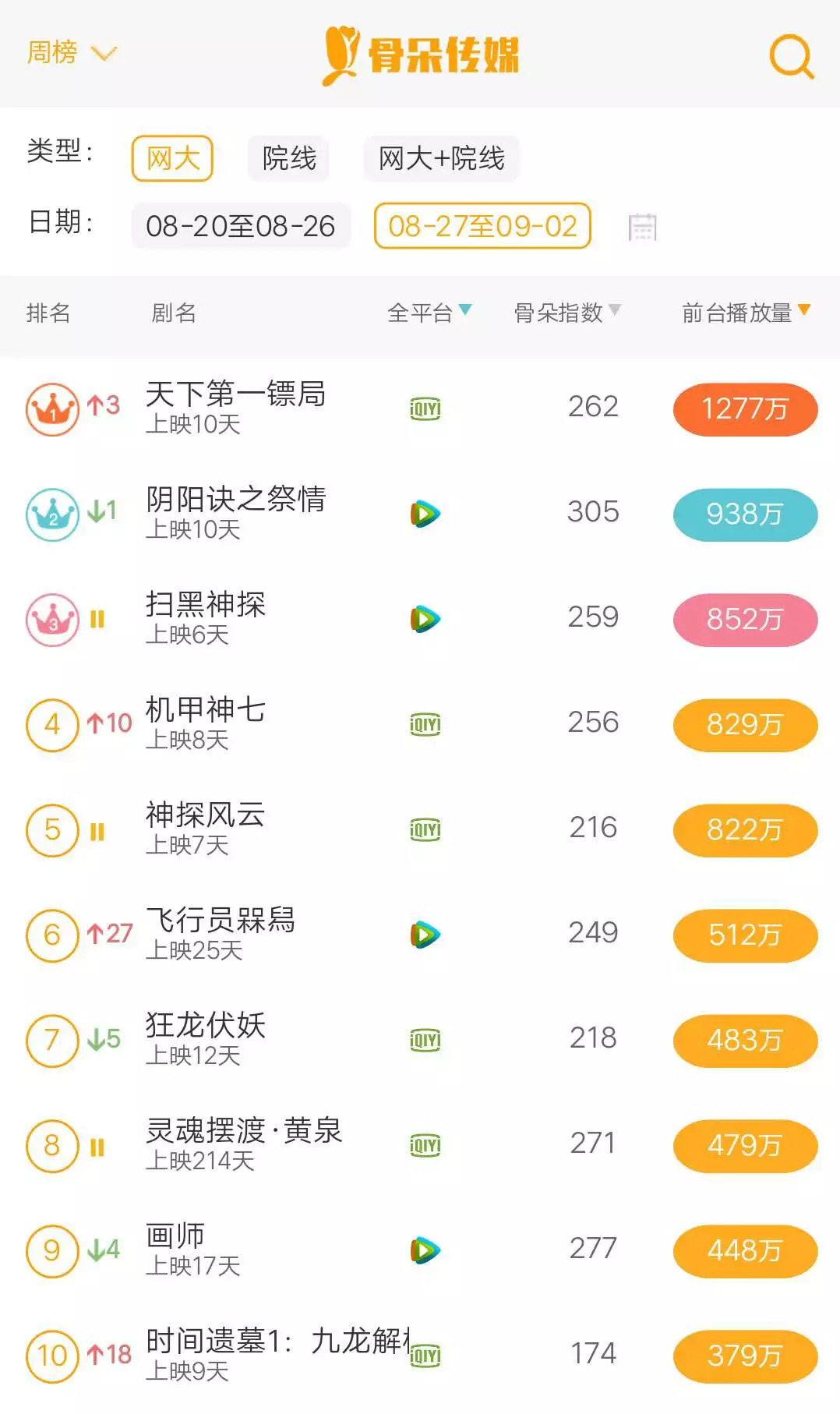 第35周网络电影骨朵周榜中,爱奇艺新上线网大《天下第一镖局》以1277万的周播放量登顶top1,排位自上周上升3个名次。