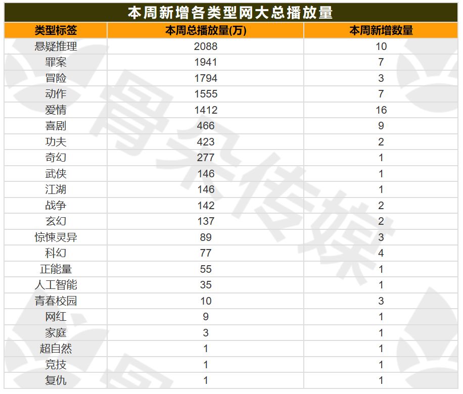本周总播放量突破1000万的类型标签分别为“悬疑推理”“罪案”“冒险”“动作”“爱情”,共计5个类型标签,“喜剧”类总播放量不足千万。