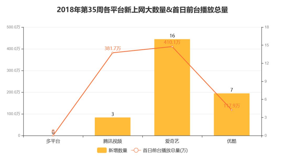 第35周各平台新上网大数量与首日前台总播放量中,爱奇艺新上网大数量最多,前台播放量上,爱奇艺首日前台播放量居首位。