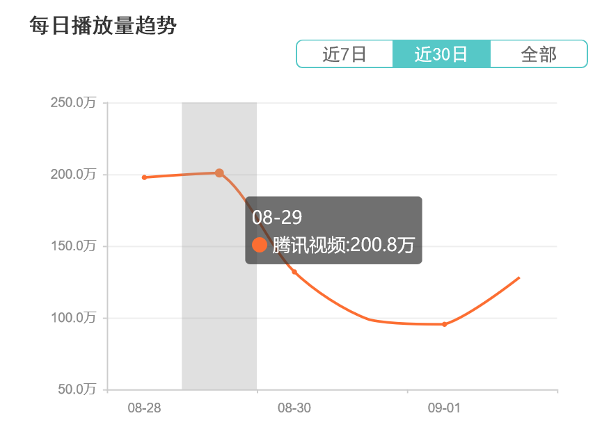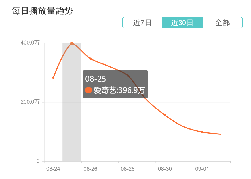 在播期间居骨朵数据榜榜首1次,跻身前三甲5次,最高单日播放量达200.8万,之后播放量呈现下降趋势,不过在9月1日之后该片播放量呈现增长趋势。