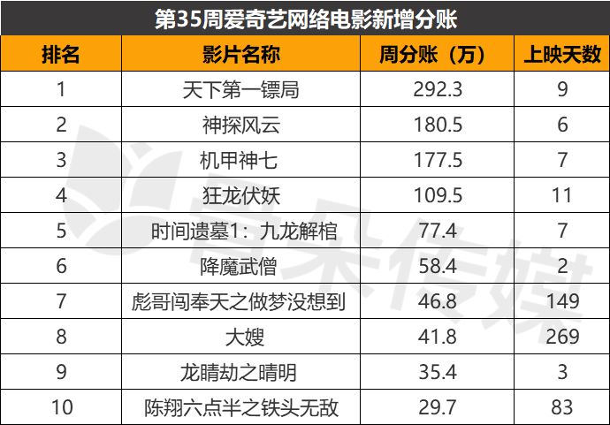 第35周爱奇艺网络电影新增分账中,《天下第一镖局》《神探风云》《机甲神七》分别以292.3万、180.5万、177.5万的票房分账占据前三甲。