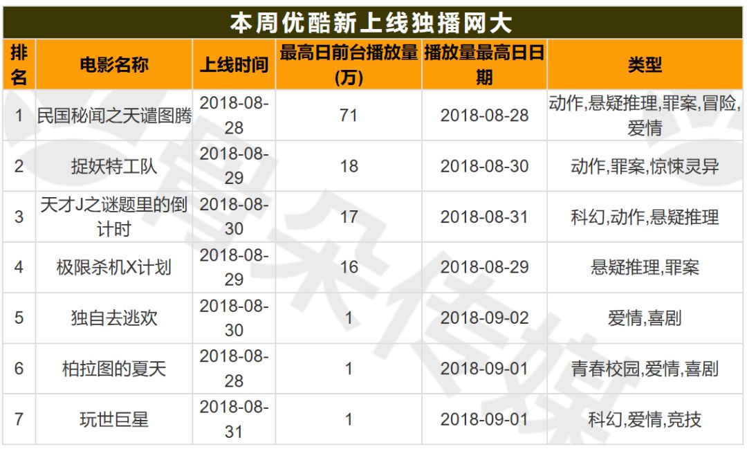 优酷本周上线7部独播网大,较上周增加1部,首日前台播放量117万,较上周减少48万。