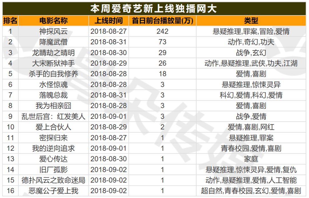 相比上周而言,本周首日前台播放总量达到近几周最低,这种情况可能与头部大片缺失有关。