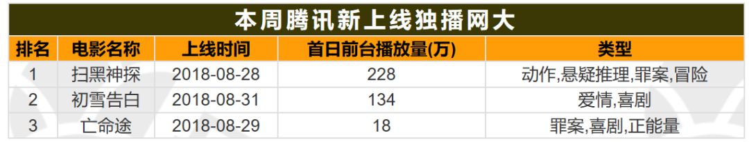 本周,腾讯视频两部影片《归黑神探》《初雪告白》首日前台播放量突破100万,分别为228万、134万。