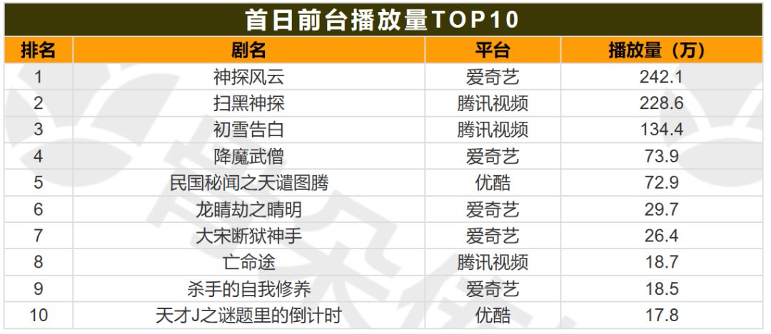 首日前台播放量top10中,《神探风云》以242.1万的点击量排名第一;《扫黑神探》以228.6万的首日前台播放量排名第二;都市爱情片《初雪告白》以134.4万的首日前台播放量位居第三。