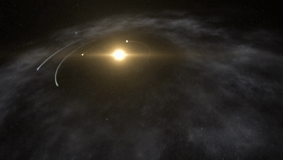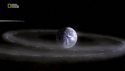 当它们发生碰撞后,大量的冰雪就散落在了地球轨道上,然后形成一圈白色光环,就像土星环那样。