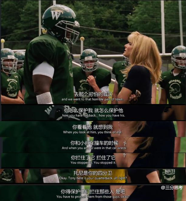 在球场训练时,因为迈克尔始终不得要领,陶西太太告诉他,要像保护陶西一家人一样地去保护队友。