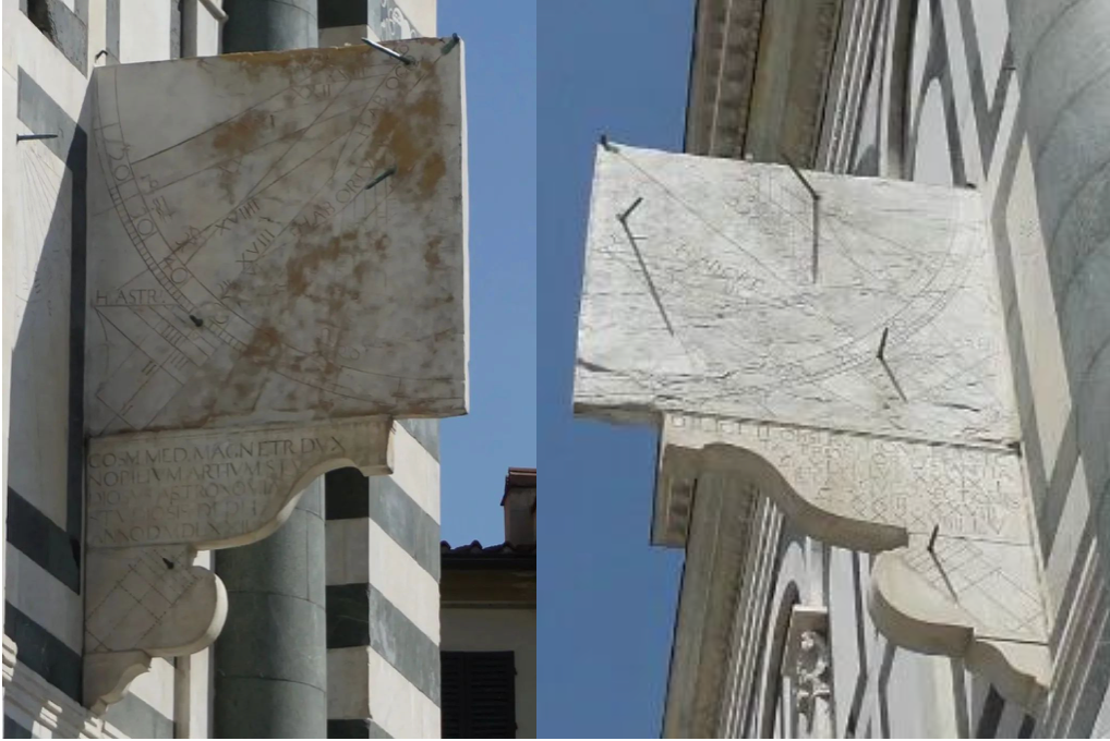 新圣母大殿教堂的外立面具有科学特征的地方,是分别在左右两侧墙面上的天文表盘和春分浑天仪。1572-1574 年,天文学家、数学家丹蒂 (dominican ignazio danti)在了解佛罗伦萨市的纬度(43° 40’)后,在新圣母大殿的正面安装了这些天文仪器,他的目的是对子午线进行一系列观测和相关研究。这些观测和相关研究对于准确测量回归年的长度和两个分点的时间是十分重要的:这是作为当时的历法改革和确定基督教节期的重要基本参考。
