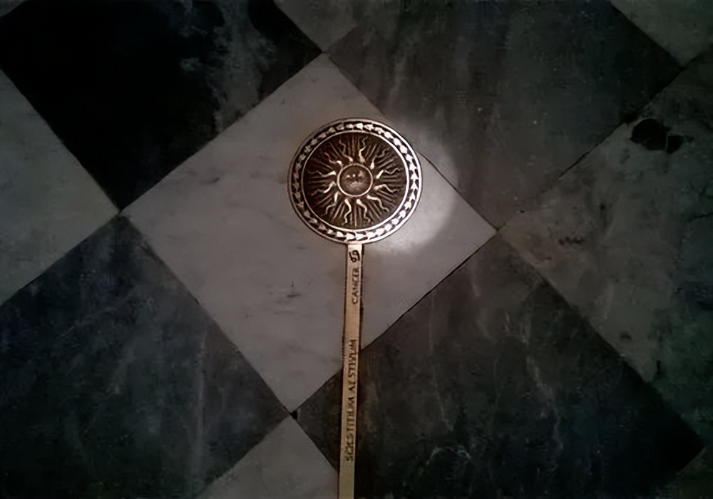 另外还有一个较为特殊的天文仪器。我们见到过的日晷通常都是在室外应用,晷针是一根杆子、一根柱子或一个方尖碑,利用被太阳照射的晷针投下的影子方向来测定并划分时刻。1574年丹蒂在新圣母大殿中设计了用于室内的日晷。由玫瑰花窗下的孔洞(图4)和教堂内地面上的青铜子午线(图5)构成,子午线从南到北长度约41米。