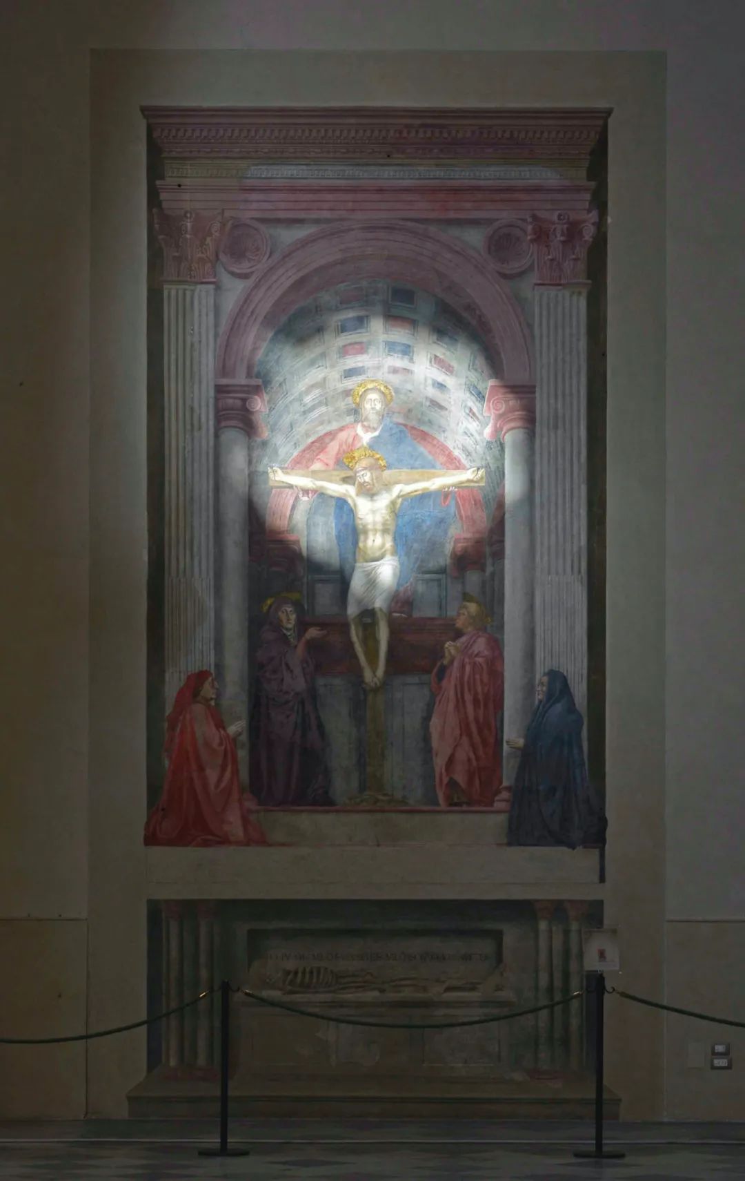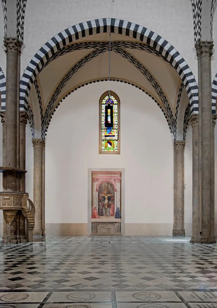 在新圣母大殿中还有一处壮观的景象,位于教堂的中殿内左侧的第三个拱廊中,是意大利文艺复兴绘画的奠基人马萨乔(masaccio)创作于1427年的壁画《圣三位一体》。