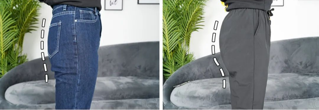 " 看小编和同事亲自上身后的穿着对比,同样是偏紧身的裤子,这款羽绒裤非但不显腿粗和腿弯,反而把腿修饰的又细又直,简直就是“魔法”~