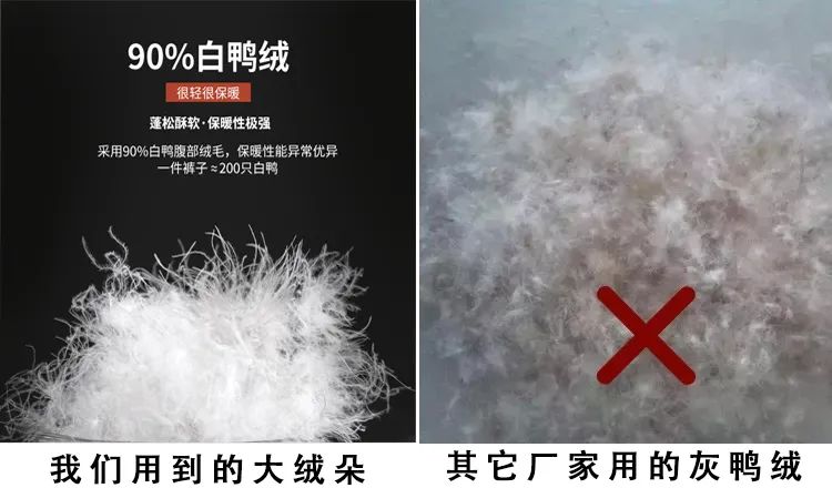 而且这些都是90%白鸭绒优质大绒朵,超市面上其它羽绒裤20%的含绒量,不仅拥有极佳的亲肤舒适性,保暖性也比其它款要高50%。