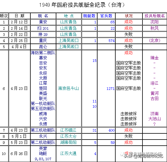 其中,前3次均在青岛。在成功起义的15次中,共有起义舰艇97艘,起义官兵3800多人,几乎占了国民党海军总兵力的十分之一,极大地影响了国共两军的士气和战局。