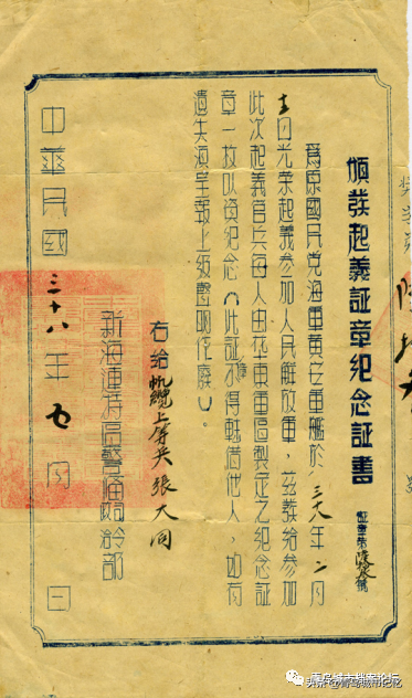 关于起义官兵人数,资料记载为65人。但据参加起义年龄最小、晋升军衔最低的“上等兵”张大同确认是63人。因为他顺序排名最后的“光荣起义”纪念证、纪念章的编号都是63号(图四)。加上鞠庆珍带上舰的“老乡”田秉吉和包括一名婴儿在内的8名家属,全舰共有72人。对此,还有谷牧的一段大会讲话为证:“两个‘黄子号’都了不起,黄花岗72烈士都牺牲了,黄安舰72勇士一个也没少”。并转达了中央军委副主席周恩来的指示:“全体人员均需留用,不要更动一人”。
