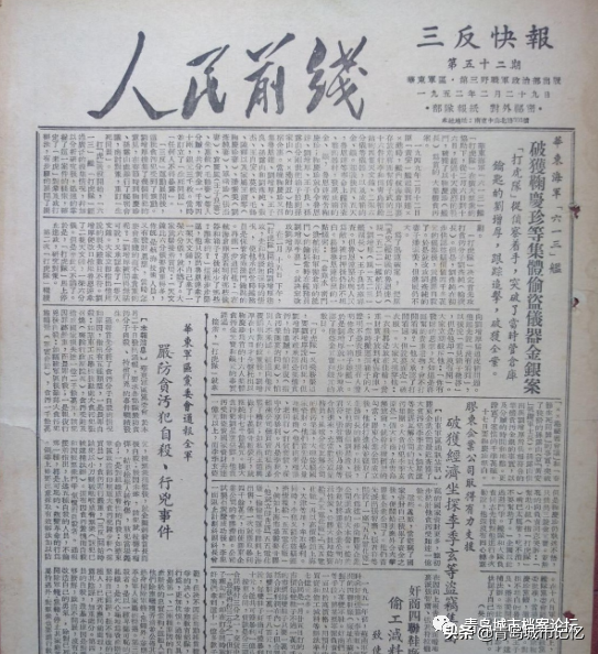 据张大同回忆,在1951年的“三反”运动中,为完成“打虎”指标,鼓励“大胆怀疑”。水兵万荣就“大胆举报”曾看见起义前从青岛搬上来两个大皮箱,起义后就不见了,怀疑装的是黄金。这个“黄金案”就成了当时华东海军的第一大案。1952年2月第52期华东军区《人民前线(三反快报)》还在头版头条刊登了“华东海军破获鞠庆珍等集团盗窃仪器金银案”的战绩(图五)。当“打虎队”到青岛“起赃”时,发现各家连温饱都成问题,哪有什么黄金的影子。后经查实此案纯属捏造,所谓“成功破案”也是屈打成招。这期间,军官刘彦纯因受不了“黄金案”的怀疑审查,在卧舱里偷拿副舰长孔庆坤枕下的手枪自杀了。