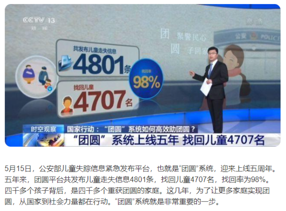 根据公安部“团圆”系统提供的数据,系统上线五年,收到儿童走失信息4801条,找回儿童4707名,假如余下的那94名儿童全部被拐走了,那算下来,每一年,有大约20名儿童被拐走。