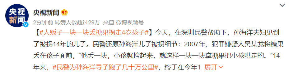 现在是2021年了。再也不是孙海洋儿子被拐走的,人贩子猖獗的年代。