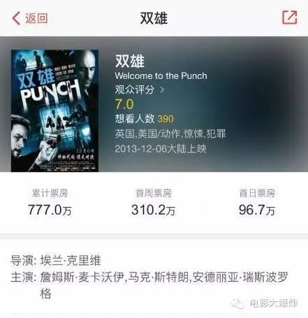 导演上一部电影,由一美麦卡沃伊主演的《双雄》也曾在3年前的同档期引进内地,最后只卖了777万,这部片子也不会好到哪里去吧……