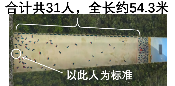 再算下通关需要速度。从第一集里的场地俯拍镜头可以看出,整个赛道约31个人体长度。按韩国男性平均身高1.75m来算(图中目测为男性),跑道总长度应为54.3m。