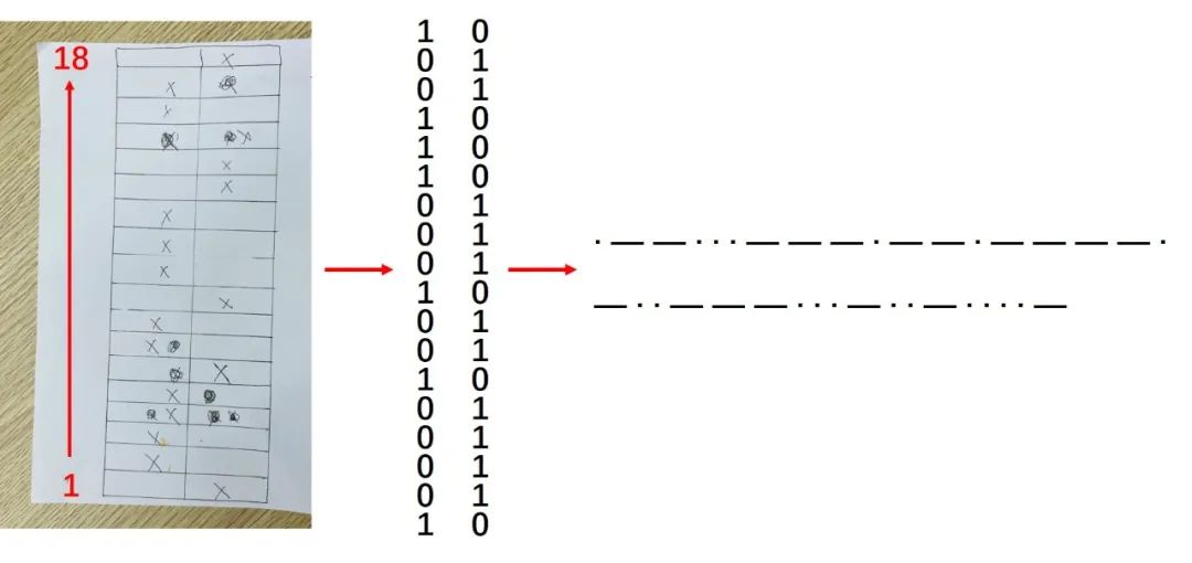 我们将强化玻璃和易碎玻璃的位置分别用1和0来代表,可以得到两列数字。稍微旋转并发挥下想象力,把0看作“·”,1看作“—”,你会发现这完全就是一组摩斯电码!
