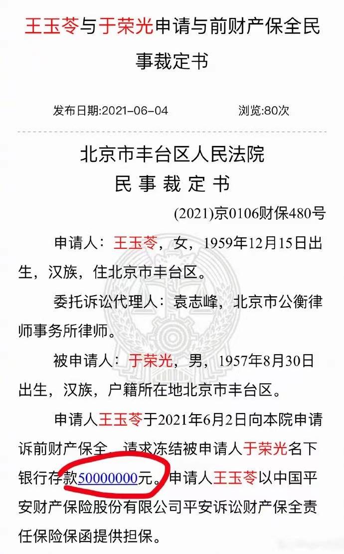 根据其中的内容显示,王玉苓早在2021年6月就向法院提起了诉讼,要求冻结于荣光的财产。