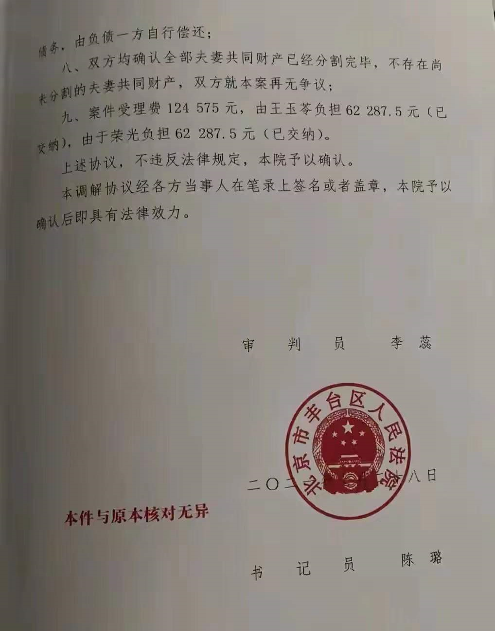 据悉,是王玉苓提交了“冻结于荣光5000万存款的申请”,外界才知道,原来这对老夫老妻也挺不住了。