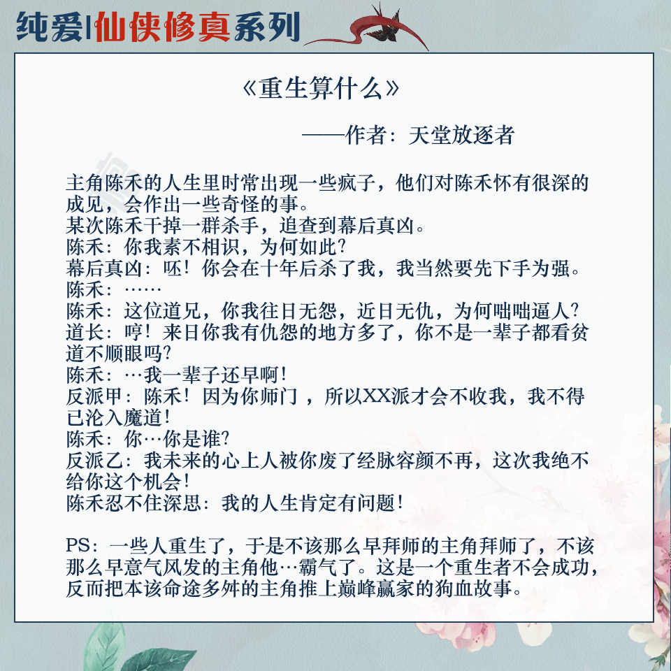 简评:反重生文。男主上辈子是魔道尊者逆天飞升,不被天道认可,所以强行倒转时光,并安排一打重生者设下种种阻碍与杀身劫。然而这并不影响男主身上闪闪发光的主角光环,当他的敌人们重生后想致他于死命时,他总能在险境中遇到另外一种机缘。从第一次被暗害说出,掉入悬崖,悬崖底是一群牛气冲天的修仙大能,还有一个美貌无敌、清心寡欲的攻君在等着与他了结因果。简而言之,只要重生者带着先知企图虐他时,总会为他带来各种机遇与仙缘,原本命运多舛的修仙路也在敌人的推波助澜下,一路开挂提前“酷炫狂拽霸”,还意外收获了忠犬攻君一枚,与他相互扶持,大杀四方、所向披靡,使得所有阴谋诡计在实力面前都成为浮云……