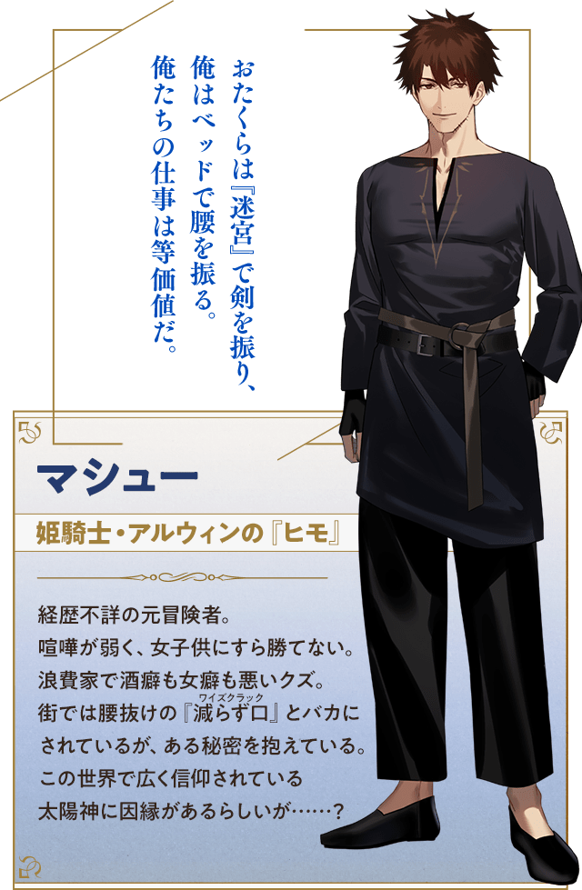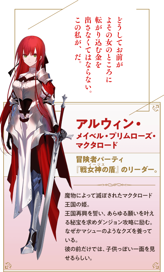 姬骑士阿尔温是被魔物消灭的麦克陶劳德王国的公主,为了复兴祖国她进入迷宫寻找可以实现一切愿望的星命结晶,而男主马修就这次冒险行动的急先锋!
