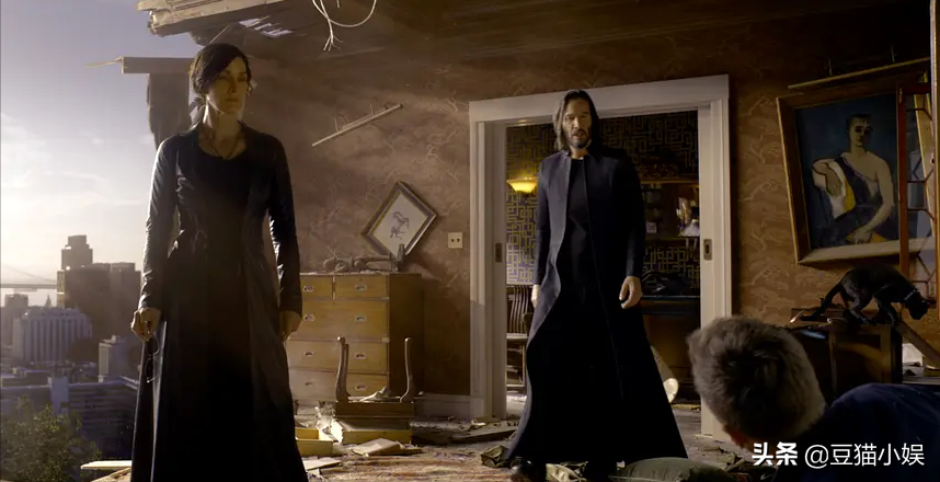 其实答案也很简单,因为观众根本没有耐心重新看一个新的人物,即便是在同一世界观内,因此虽然电影开头是用新人物白兔来进行一次倒反式的冒险,我们可以看到之前尼欧赖以被引导去「爱丽丝梦游仙境」的白兔,现在则是反过来去寻找尼欧。而她没有找到尼欧,却找到一个类似《骇客任务》平行版本的开场,她仿佛是进入《骇客任务》电影的观众般,在一旁重新观看这一切。