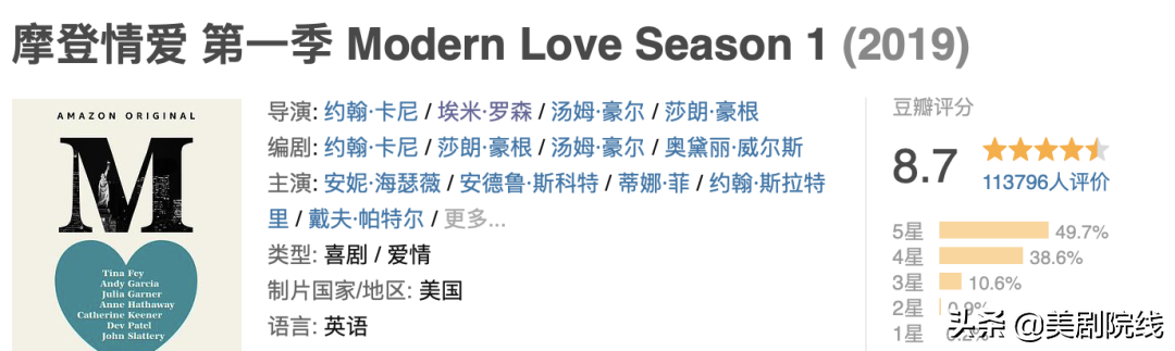 《摩登情爱》首季豆瓣评分8.7,一共8集,每集一个独立故事,每集用一个别有趣味的故事来讲述生活在纽约人们的感情生活。