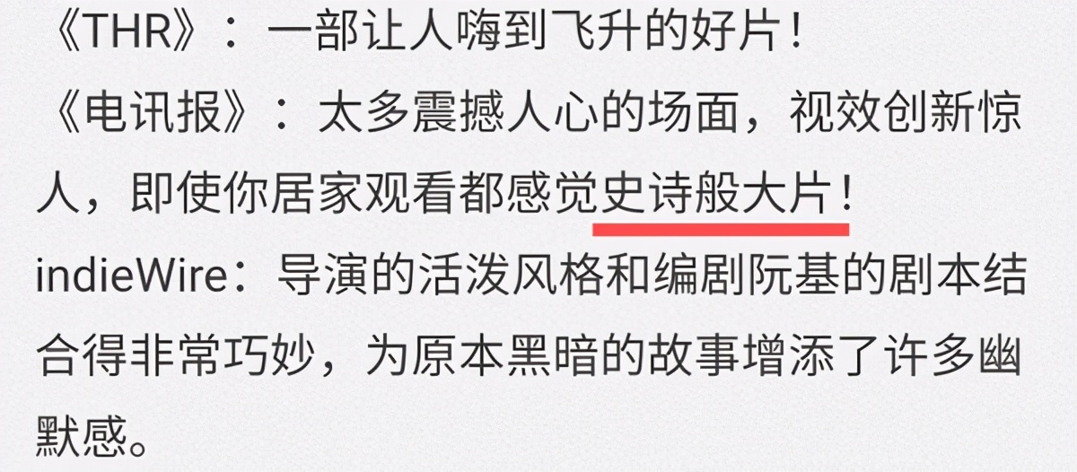 国外媒体在首轮观影之后,纷纷给予这部动画电影超高的评价。他们认为这部电影视效惊人,嗨到飞升,是一部难得的史诗级大片