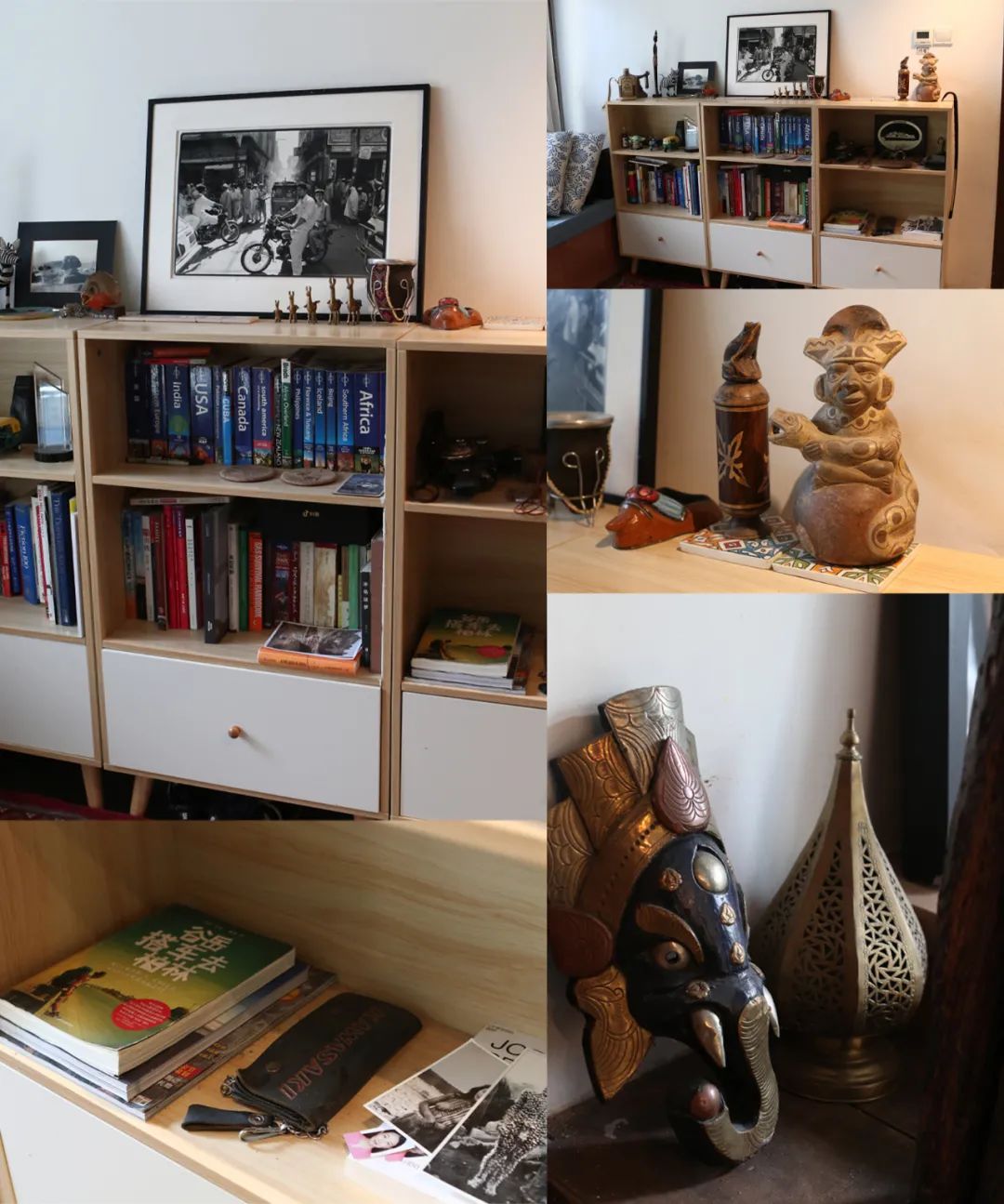 他的镜头仍在搜索,继而落在那些看似长时间无人问津的角落:一个带墨西哥阿兹特克色彩的木头人像、一套智利带回的羊驼摆件和一个角落里塞着的,大大小小、不同式样的行李箱。