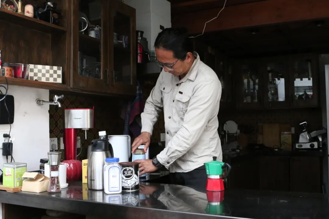 镜头前这位“咖啡师”手法有些生疏的样子,他握着一只摩卡壶,将错放在底部水槽中的粉末重新倒出来,填入上方的粉槽内。