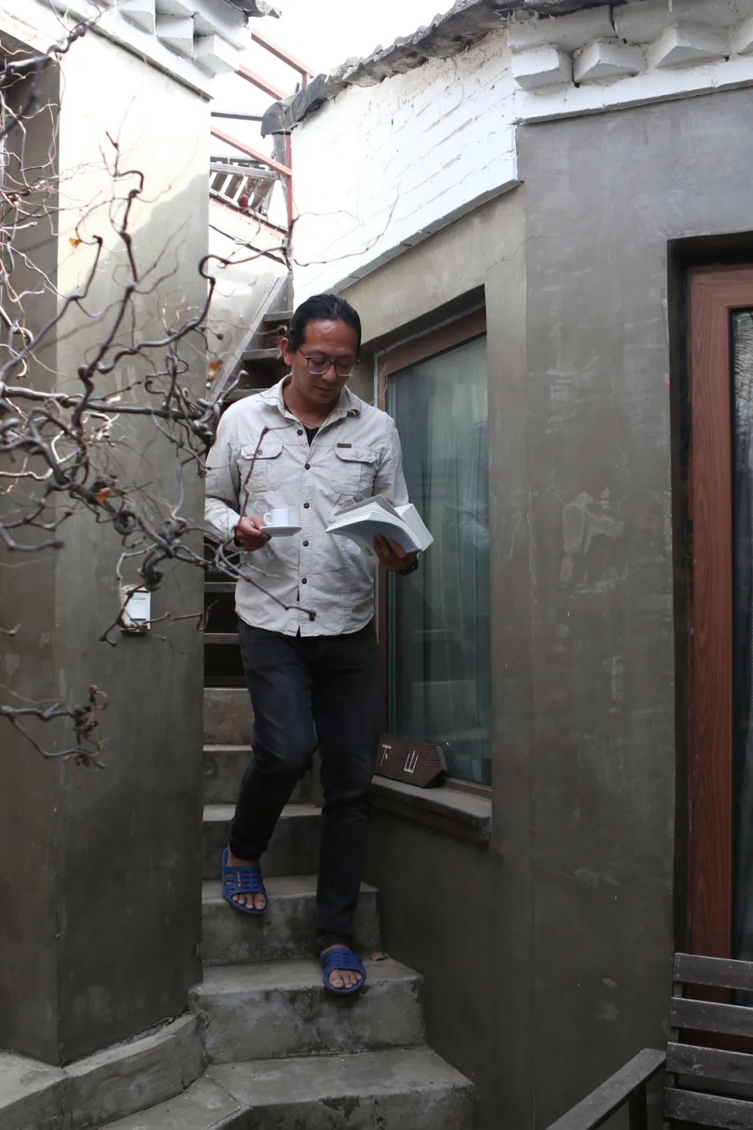 进门处的院子,一边放着辆复古自行车,一边是葡萄藤,隆冬后树叶全然凋敝,留下卷曲的光裸枝干。院子右手边是通往露台的狭窄阶梯,阶梯上竖了个写着“下山”二字的箭头标牌。