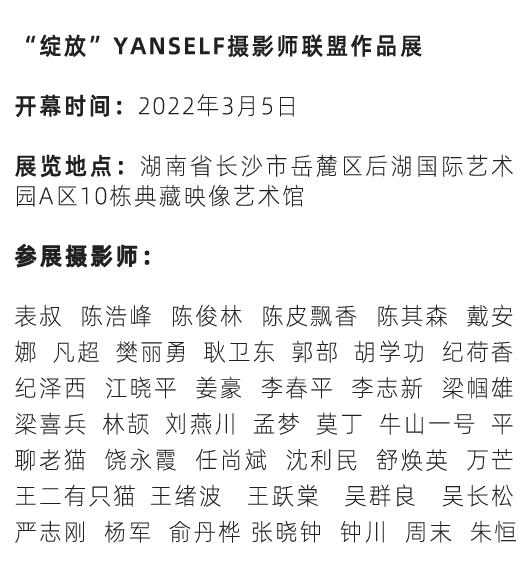 3月5日,我们在长沙筹备了yanself摄影师联盟的第一次展览——“绽放”,作为正式的登场。欢迎广大摄影师朋友到现场观展并参加论坛和街拍活动~