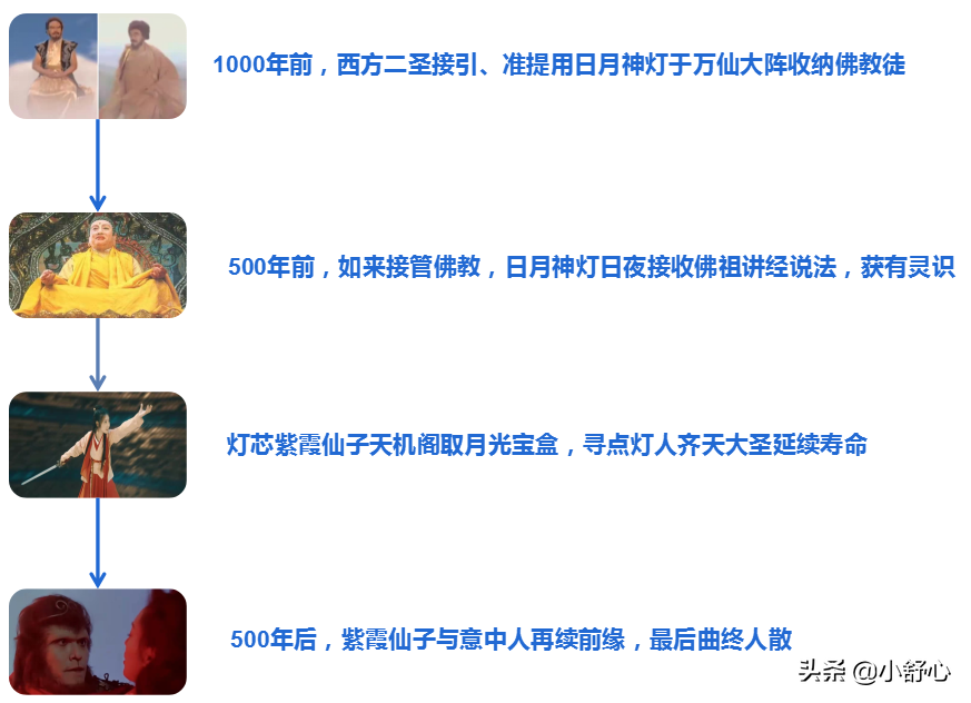 在这次封神大劫中,接引、准提依靠日月神灯收纳众多门徒。500年后,如来执掌西方世界,日月神灯也归如来管辖,日月神灯化作佛前青灯,日夜听佛祖讲经说法,久而久之,染上神异,灯芯生出灵性,拥有灵识,一分为二化作人身,为紫霞仙子、青霞仙子。