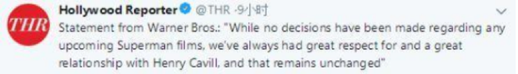华纳也在同时发布了一条声明”虽然关于未来的超人电影还没有任何相关决策,但我们一直都很尊重亨利卡维尔,保持了非常良好的关系,并且从未改变“。