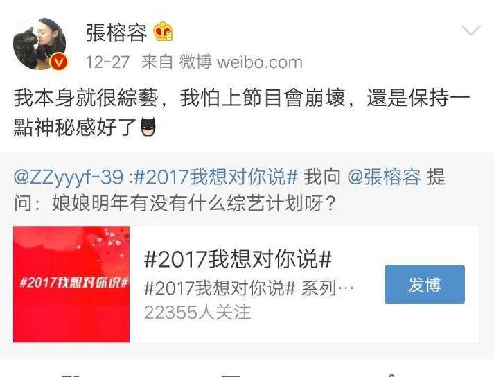 很多演员在演完一部电影之后就会马不停蹄的参加各种综艺宣传电影,增加自己的热度,也增加电影的热度,但是张榕容几乎没有参加过任何综艺,微博上有人问她有没有综艺计划,她却说要保持一点神秘感。