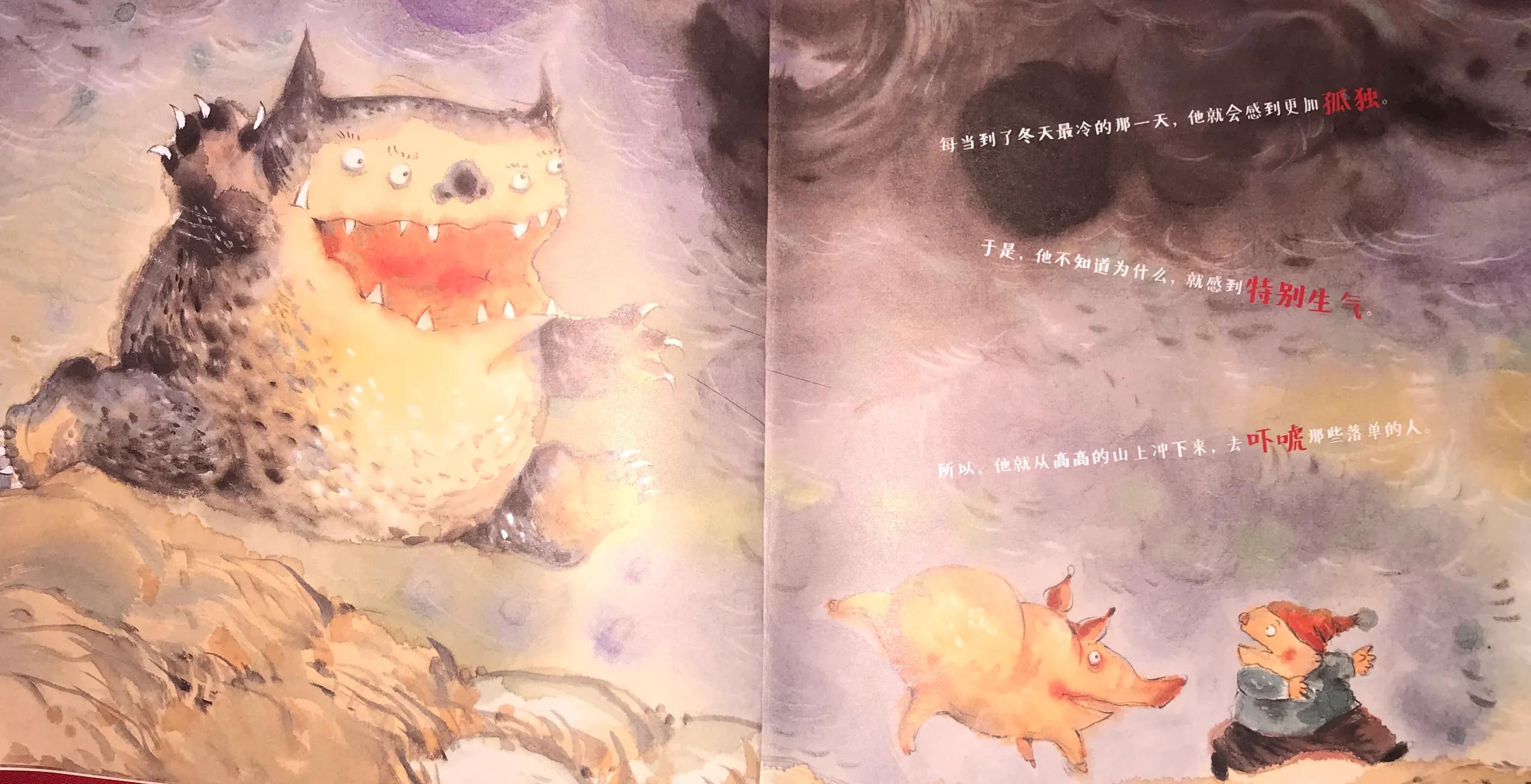 你们知道“年”是什么吗?它是寒冬里孤独感慢慢聚积而成的一个怪物。每到冬天最冷的时候,他就会特别生气,从山上冲下来,抓住那些孤独的人,把他们吞掉……救命啊!
