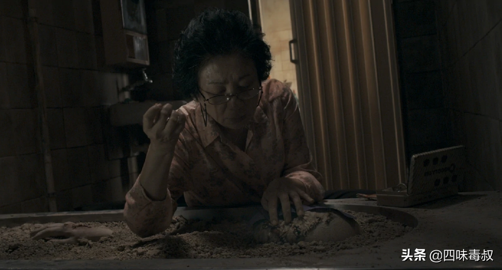 镜头俯视下,正在麻木缝补衣服的梅姨停顿了一下,然后带着“小白”进了厕所,随后把门关上——