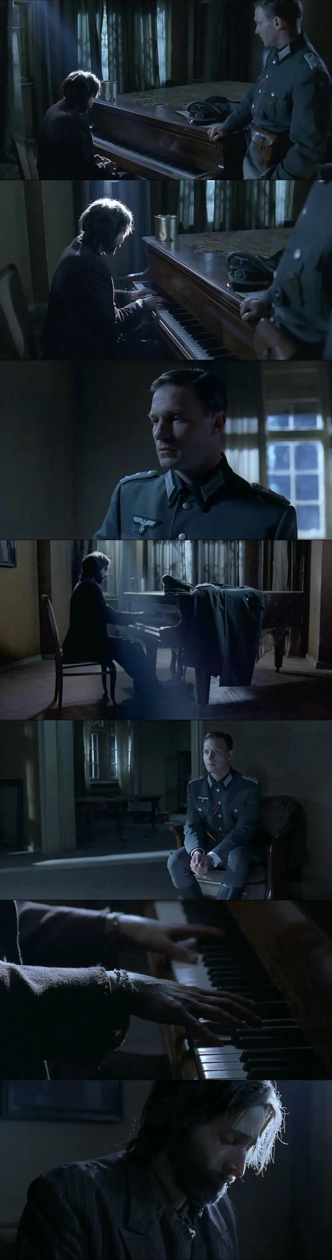 他想二者并用想打开罐头,但没想到敲击的声音吸引到了一位德军的军官。他看着斯皮尔曼,问到:犹太人?斯皮尔曼点了点头。军官又问到:你生活在这?斯皮尔曼又点了点头。军官问到:你是干嘛的?斯皮尔曼回答道:我是一名钢琴师。于是军官带着他来到钢琴面前,弹一曲试试。斯皮尔曼来到钢琴前,也没有忘了带上他的罐头。斯皮尔曼演奏了一曲:肖邦第一叙事曲,手指还是如行云流水一般,在琴键上跳动,琴声由平缓到急促,似乎在宣泄他愤怒的情绪,他也许认为这是他人生中最后的一首钢琴曲。一曲过罢,德军的军官也被艺术所打动,沉醉其中。