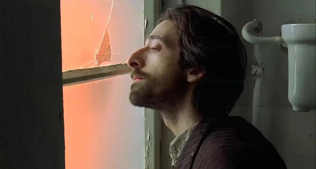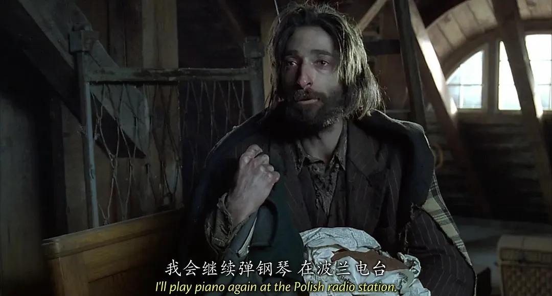 他已经不是那个高大英俊,受人尊敬的有着体面工作的钢琴家了。此刻的他瘦弱无比,头发齐肩,胡须脏乱无比。此时支撑着他的唯一一件事,就是活着。他穿梭在一个又一个的残垣断壁,只为了寻找食物和水。他太饿了,加上又要躲避小规模德军的搜捕。看着他们吃着肉罐头,他渴望不已。