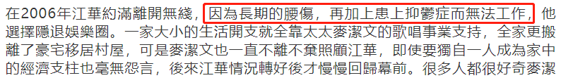 但是在2006年拍摄《红拂女》时他腰伤复发,在养伤过程中由于承受巨大精神压力江华患上抑郁症。