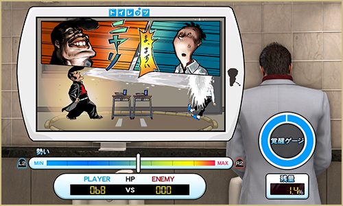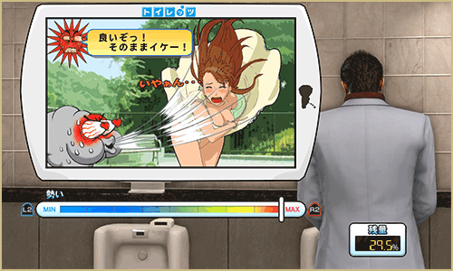 另一个有趣的新游戏“来去小便”是取材自sega早年推出的店用便斗电子广告pop(看样子貌似只能供男厕使用),以“厕所也能是游乐场”为口号,诱使人们“排水”时与便斗内传感器来进行互动的游戏,不但能让男生在小便时瞄得更准更清洁,而且还能获得额外的快感和乐趣……简直是一举多得的神发明(可惜如今已停产,原因不明)。不过想要玩这个游戏,玩家就需要事先为自己的膀胱充能了,这无疑为满街无人问津的自动饮料贩卖机提供了最好的存在意义……