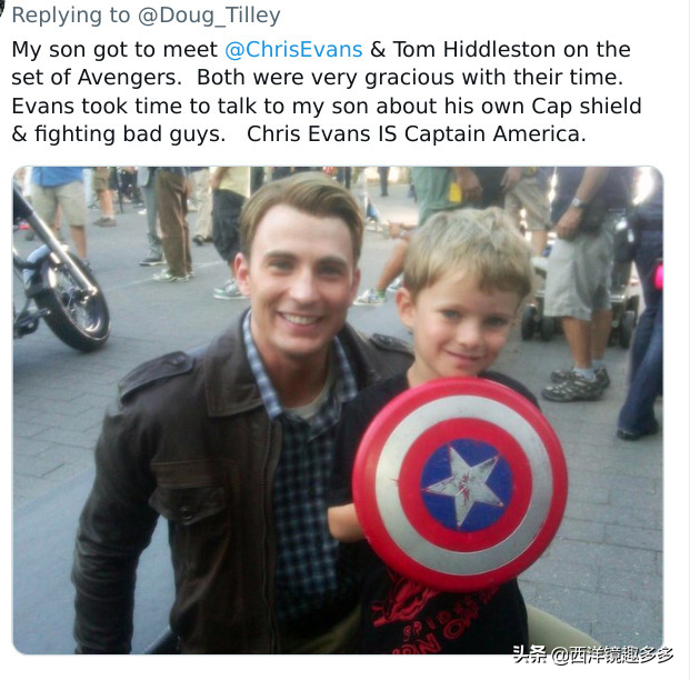 这位网友的儿子曾在《复联》片场见到了美队和抖森,美队还和小男孩聊起了他的盾和如何打坏人