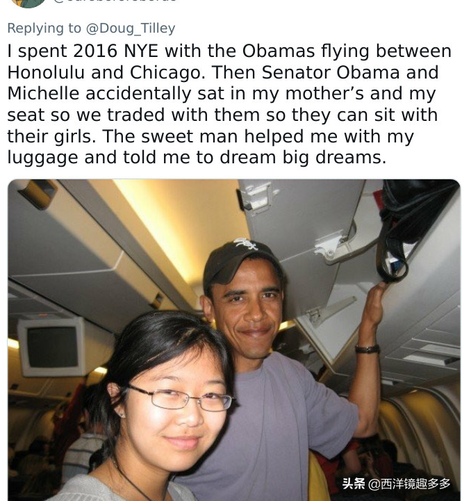 这位网友曾在飞机上遇到了奥巴马,奥巴马还帮她放了行李!