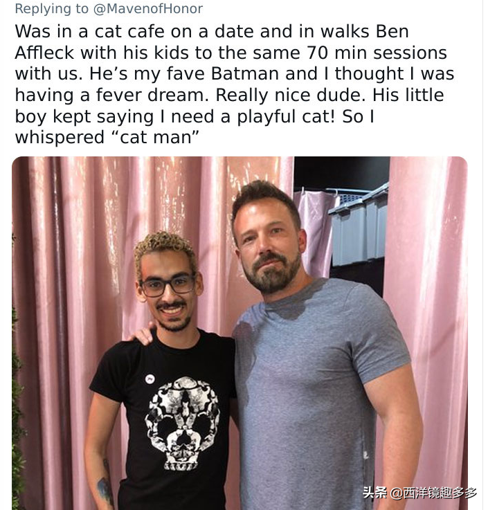 这位网友在一个猫猫咖啡馆约会的时候,遇到了本阿弗拉克,还告诉大家蝙蝠侠人很好啊